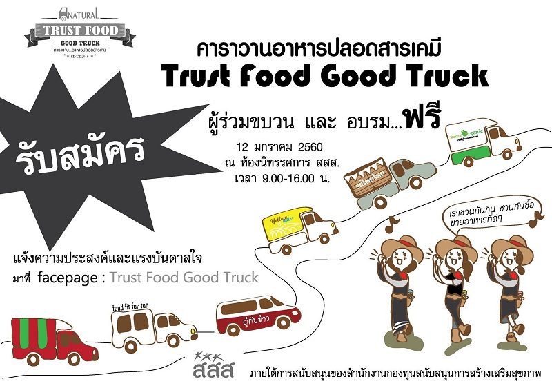 ใครอยากทำ Food Truck ห้ามพลาด สำนักงานกองทุนสนับสนุนการสร้างเสริมสุขภาพ (สสส.) เปิดรับสมัครผู้ประกอบการ Food Truck เพื่อมาร่วมเรียนรู้วิธีขายอาหารแบบ Food Truck ให้ปลอดภัยและประสบความสำเร็จ โดยกิจกรรมจะมีในวันพฤหัสบดีที่ 12 มกราคม 2560 ณ ห้องนิทรรศการ อาคารศูนย์เรียนรุ้สุขภาวะ สสส. ตั้งแต่เวลา 9.00-16.00 น. และจะปิดรับสมัครภายในวันที่ 6 มกราคม 2560 นี้ สอบถามรายละเอียดเพิ่มเติมได้ที่แฟนเพจ Trust Food Good Truck