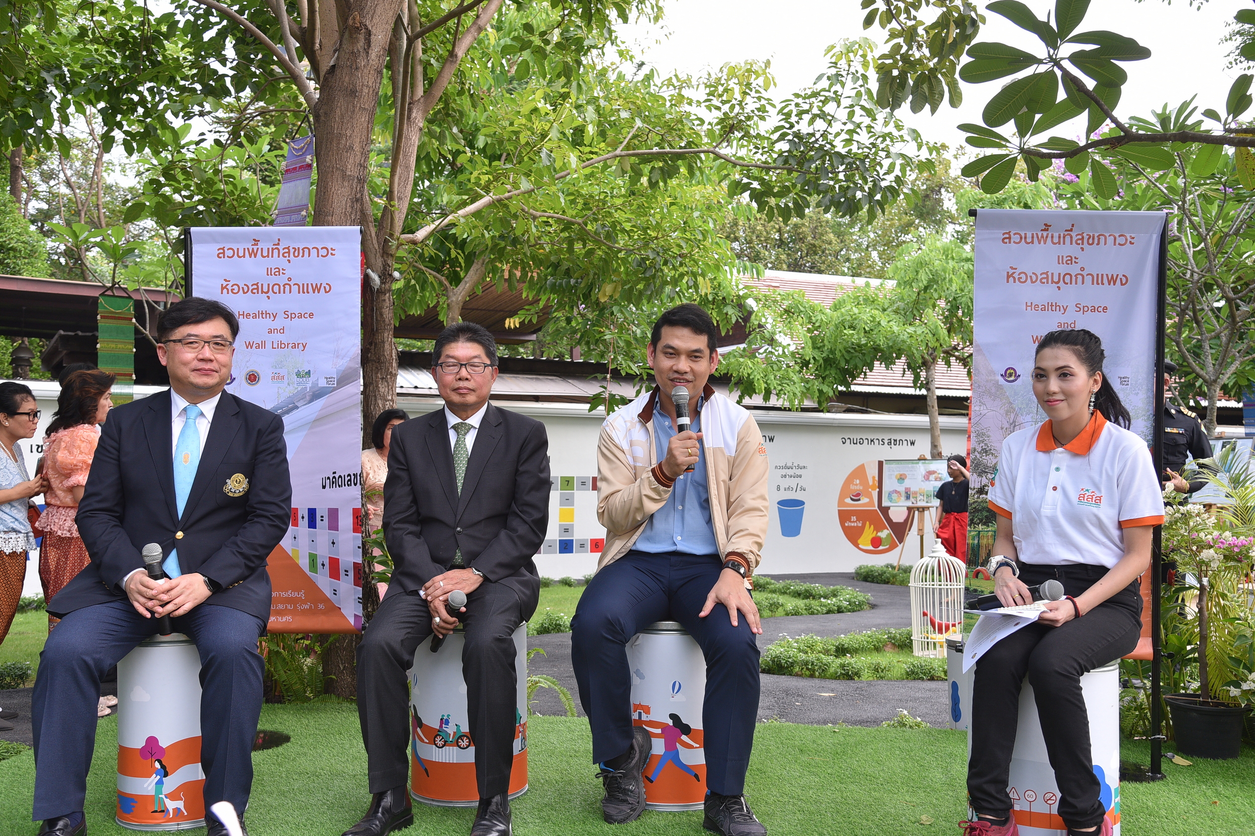 ขณะที่ ดร.นพ.ไพโรจน์ เสาน่วม ผอ.สำนักส่งเสริมวิถีชีวิต สุขภาวะ สสส. กล่าวว่า ด้วย สสส.มีความตั้งใจที่จะจัดการให้เกิดพื้นที่สุขภาวะต้นแบบใน 9 รูปแบบการจัดการ ซึ่ง 1 ในนั้นคือ พื้นที่ชุมชนหรือย่านเมืองที่สามารถ "พัฒนาเป็นศูนย์เรียนรู้ได้" และพื้นที่ชุมชนหลัง ม.สยามก็ได้รับเลือก และถูกพัฒนาจนกลายเป็นสวนพื้นที่สุขภาวะฯที่มีความพิเศษคือ มี "ห้องสมุดกำแพงแห่งแรกในประเทศไทย" เป็นแหล่งข้อมูลสุขภาพบนกำแพง และมีหนังสือหลากหลายประเภทให้คนในชุมชนได้ยืมไปอ่านด้วย