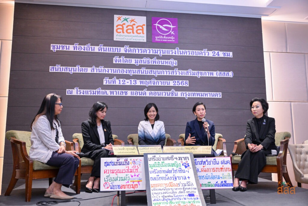 วันที่ 13 พ.ย. 2568 ที่โรงแรมทีเค พลาเลส กรุงเทพฯ สำนักงานกองทุนสนับสนุนการสร้างเสริมสุขภาพ (สสส.) ร่วมกับ มูลนิธิเพื่อนหญิง เครือข่ายสตรี 4 ภาค และเครือข่ายพัฒนากลไกสหวิชาชีพพื้นที่นำร่อง 4 จังหวัด จัดกิจกรรมเสวนาหัวข้อ “How to..นักการเมืองหญิง ร่วมผลักดัน ท้องถิ่น ชุมชนจัดการความรุนแรงในครอบครัว 24 ชม.” ภายใต้โครงการขับเคลื่อนนโยบายและพัฒนากลไกป้องกันแก้ไขความรุนแรงบนฐานเพศ พร้อมยื่นข้อเสนอการแก้ปัญหาความรุนแรงต่อพรรคการเมือง 4 พรรค พรรคภูมิใจไทย พรรคประชาชน พรรคเพื่อไทย และพรรคประชาธิปัตย์ เพื่อสร้างพื้นที่ปลอดภัยและรับมือกับปัญหาความรุนแรงด้วยเหตุแห่งเพศ เนื่องในเดือนแห่งการรณรงค์ยุติความรุนแรงต่อเด็กและสตรี