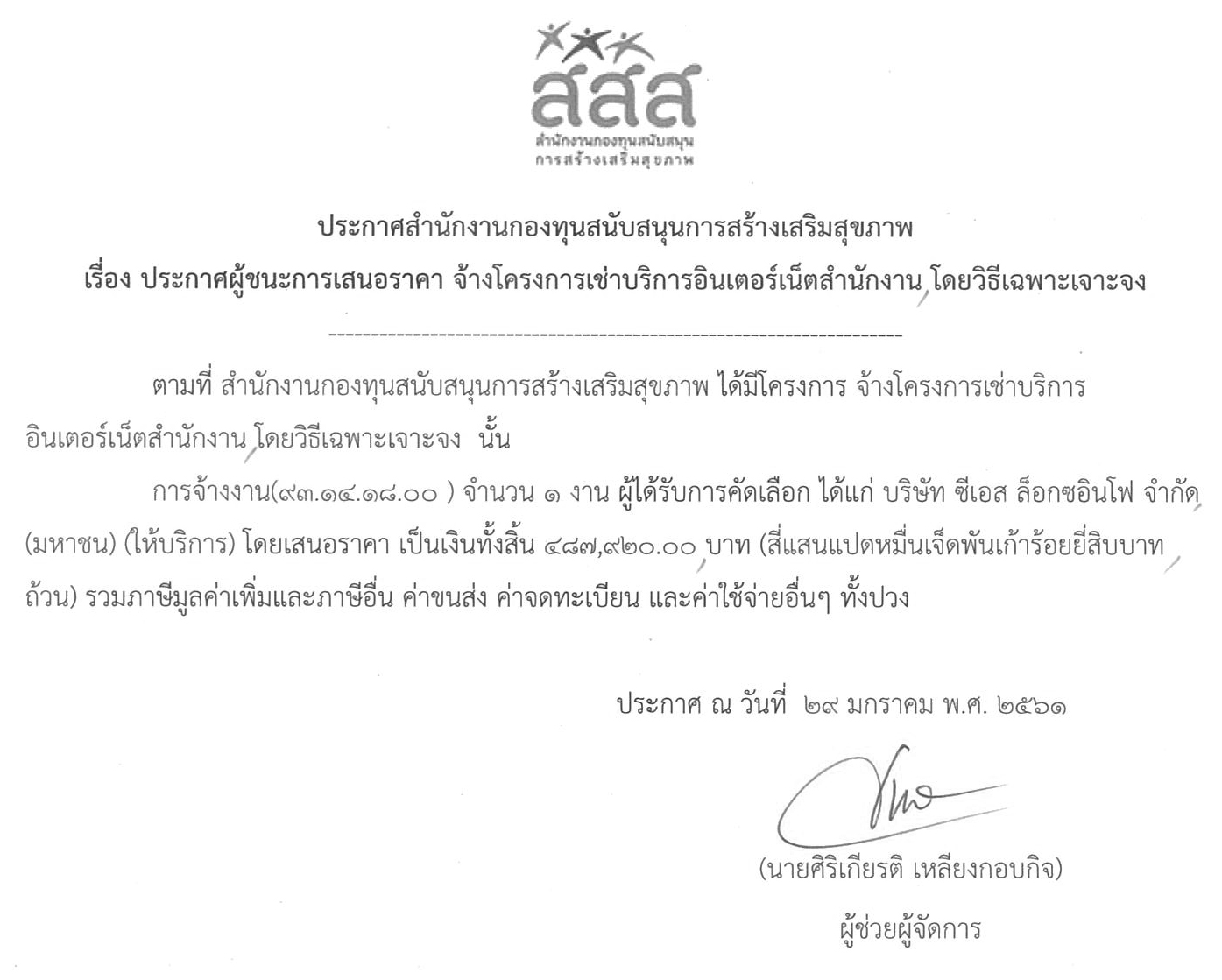 ประกาศผู้ชนะการเสนอราคา จ้างโครงการเช่าบริการอินเทอร์เน็ตสำนักงาน โดยวิธีเฉพาะเจาะจง
