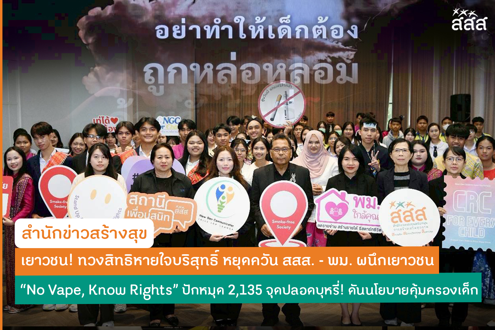 18 พ.ย. 68 44 ครั้ง เยาวชน! ทวงสิทธิหายใจบริสุทธิ์ หยุดควัน สสส. - พม. ผนึกเยาวชน “No Vape, Know Rights” ปักหมุด 2,135 จุดปลอดบุหรี่! ดันนโยบายคุ้มครองเด็ก “No Vape, Know Rights” หยุดควัน ปกป้องสิทธิ์! สสส. สานพลัง พม.-เครือข่ายนักสื่อสารรุ่นใหม่ ปลุกพลังเยาวชนทวงคืนสิทธิหายใจบริสุทธิ์ ฟังเสียงสะท้อนจริงในพื้นที่ หลังพบสูบบุหรี่ในบ้านสูงถึง 61.8% พร้อมปักหมุดพื้นที่ปลอดควันผ่านแพลตฟอร์ม Padlet กว่า 2,135 จุดทั่วไทย หวังดันสู่ข้อเสนอเชิงนโยบาย เนื่องในวันสิทธิเด็กสากล 2568
