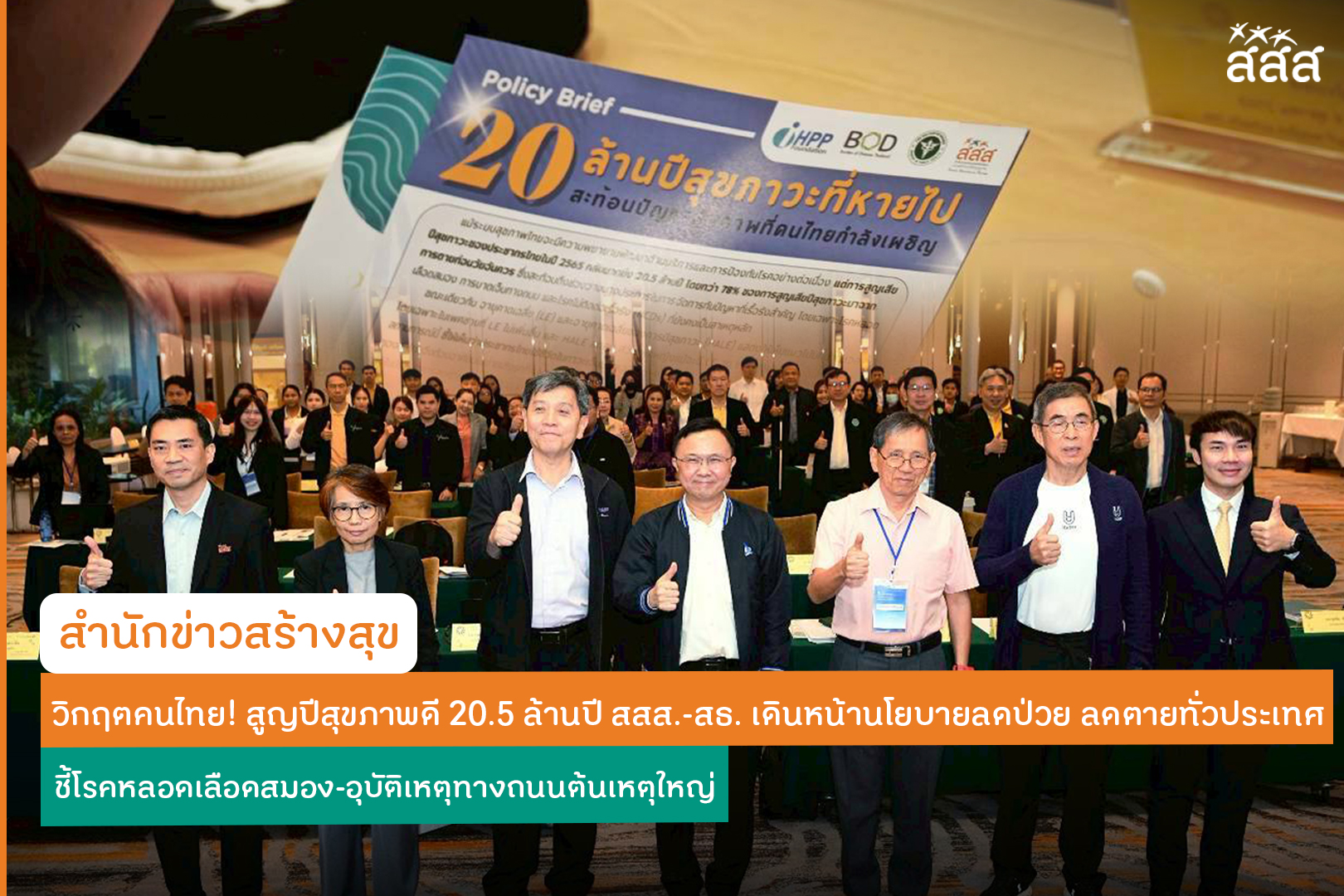 06 ต.ค. 68 76 ครั้ง วิกฤตคนไทย! สูญปีสุขภาพดี 20.5 ล้านปี สสส.-สธ. เดินหน้านโยบายลดป่วย ลดตายทั่วประเทศ ชี้โรคหลอดเลือดสมอง-อุบัติเหตุทางถนนต้นเหตุใหญ่ สสส. สานพลัง IHPP Foundation-สธ. เปิดผลศึกษาภาระโรค วิกฤต! คนไทยสูญเสีย “ปีสุขภาวะ” หรือ “ปีสุขภาพดี” พุ่ง 20.5 ล้านปี สาเหตุจากโรคหลอดเลือดสมอง 9.5% สูงเป็นอันดับหนึ่ง รองลงมา บาดเจ็บทางถนน 7.3% โรคเบาหวาน 6.2 % โรคไตเรื้อรัง 5.7 % ชี้ กลุ่มวัยรุ่น-คนทำงาน น่าห่วง พบปัญหาอุบัติเหตุทางถนนสูง ส่วนกลุ่มผู้ใหญ่-สูงวัย ป่วย NCDs สูงสุด เร่งผลักดันนโยบาย ลดตาย-ลดป่วย-พิการ คืนปีสุขภาวะให้คนไทย สุขภาพดีอย่างยั่งยืน