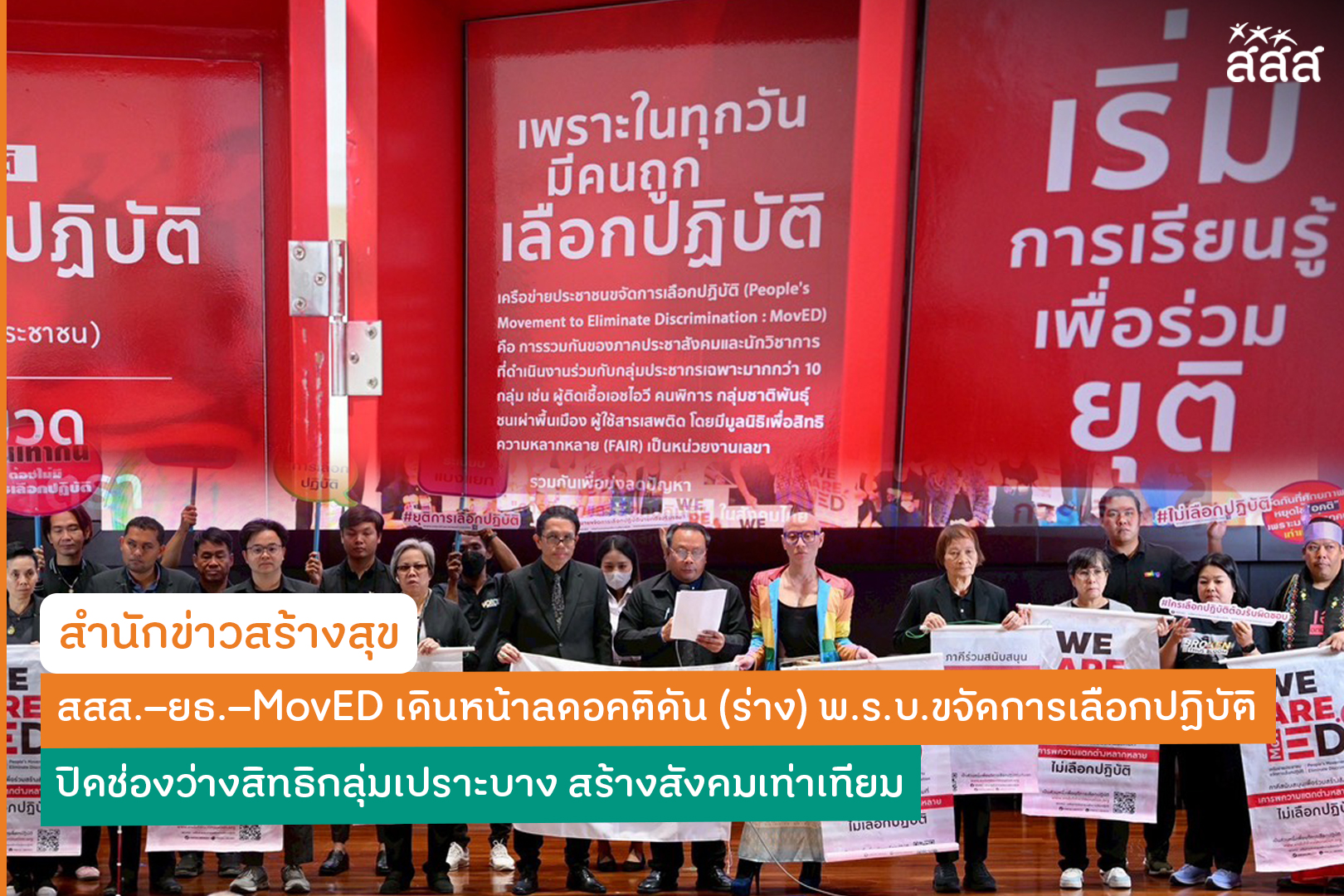 สสส.–ยธ.–MovED เดินหน้าลดอคติ ดัน (ร่าง) พ.ร.บ.ขจัดการเลือกปฏิบัติ ปิดช่องว่างสิทธิกลุ่มเปราะบาง สร้างสังคมเท่าเทียม หยุดอคติ เลือกปฏิบัติ! สสส. สานพลัง ยธ.-MovED เปิดเวทีสาธารณะ เร่งผลักดัน ร่าง พ.ร.บ.ขจัดการเลือกปฏิบัติฯ สร้างหลักประกันสิทธิให้ทุกชีวิต หลังวิจัยพบช่องว่างทางสังคมคนไร้บ้าน เผชิญอคติสูงสุดในสังคมไทย LGBTQIAN+ ถูกเลือกปฏิบัติพุ่ง 39.1% ถูกตีตราอัตลักษณ์ทางเพศสูงกว่าปชช. ทั่วไป 15.7 เท่า! พร้อมเดินหน้าหนุนร่างกฎหมายเข้าสู่การพิจารณาของ ครม.