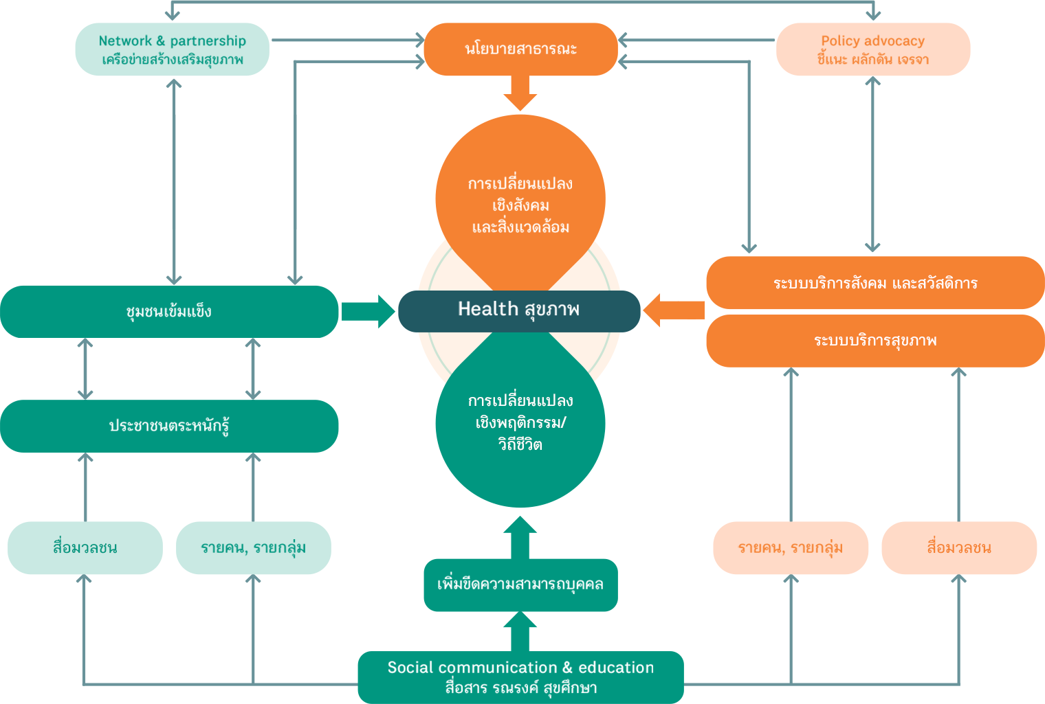 จุดประกาย กระตุ้น สาน และเสริมพลังบุคคล ชุมชน และองค์กรทุกภาคส่วน ให้มีขีดความสามารถและสร้างสรรค์ระบบสังคมที่สนับสนุนต่อการมีสุขภาวะที่ดี