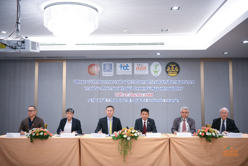 เมื่อวันที่ 27 มิ.ย. 2566 ณ รร.อมารี ดอนเมือง แอร์พอร์ต 6 องค์กร ประกอบด้วย สำนักนายกรัฐมนตรี สำนักงานคณะกรรมการคุ้มครองผู้บริโภค (สคบ.) สำนักงานกองทุนสนับสนุนการสร้างเสริมสุขภาพ (สสส.) สำนักงานคณะกรรมการสุขภาพแห่งชาติ (สช.) สภาองค์กรของผู้บริโภค และมูลนิธิวิทยาลัยการคุ้มครองผู้บริโภคด้านยาและสุขภาพ (มวคบ.) จัดพิธีลงนามบันทึกข้อตกลงความร่วมมือ (MOU) ว่าด้วยการบูรณาการเรื่อง “การพัฒนาศักยภาพองค์กรผู้บริโภคและสนับสนุนองค์กรผู้บริโภค”