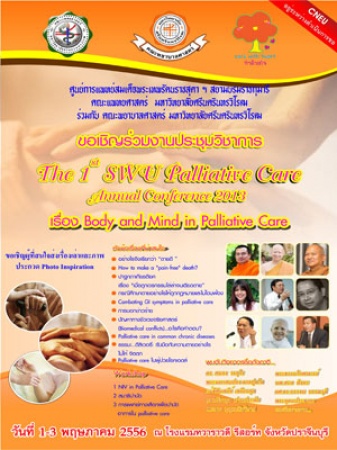 18 ก.พ. 56 13,309 ครั้ง ทางคณะแพทยศาสตร์ มศว จัดการประชุมวิชาการด้านการดูแลผู้ป่วยระยะสุดท้าย (Palliative care) ชื่อว่า Body & mind in palliative care ในวันที่ 1-3/5/56 ที่ รร.ทวาราวดี จ.ปราจีนบุรี