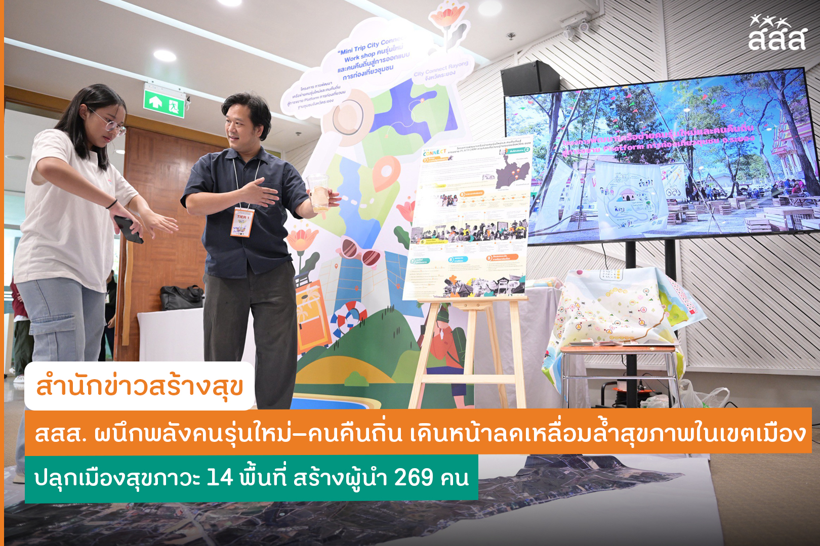 03 ธ.ค. 68 0 ครั้ง สสส. ผนึกพลังคนรุ่นใหม่–คนคืนถิ่น เดินหน้าลดเหลื่อมล้ำสุขภาพในเขตเมือง ปลุกเมืองสุขภาวะ 14 พื้นที่ สร้างผู้นำ 269 คน สสส. สานพลังพลังคนรุ่นใหม่-คนคืนถิ่น ขับเคลื่อนเมืองสุขภาวะ 14 พื้นที่ 10 จังหวัด สร้างผู้นำการเปลี่ยนแปลงได้ 269 คน เชื่อมกลไกท้องถิ่นใน 5 เมืองหลัก “ปลุกเมือง” กำหนดสุขภาวะคนไทยในอนาคต ต้องเร่งสร้างพลเมืองตื่นรู้เพื่อลดความเหลื่อมล้ำด้านสุขภาพ